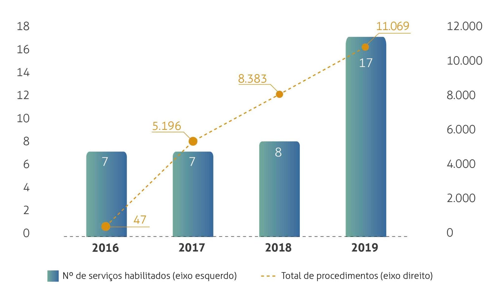 O aumento do número de procedimentos parece não ter relação com o aumento de serviços habilitados, tal como se verifica no gráfico acima. Entre 2017 e 2018, por exemplo, houve um salto considerável no número de procedimentos realizados, mesmo com a habilitação de apenas um estabelecimento novo. Vale destacar que no ano de habilitação de todos os serviços, não há registro de procedimentos realizados. Assim, olhar para esses números não permite apontar a razão do descompasso, mas é possível levantar algumas hipóteses.