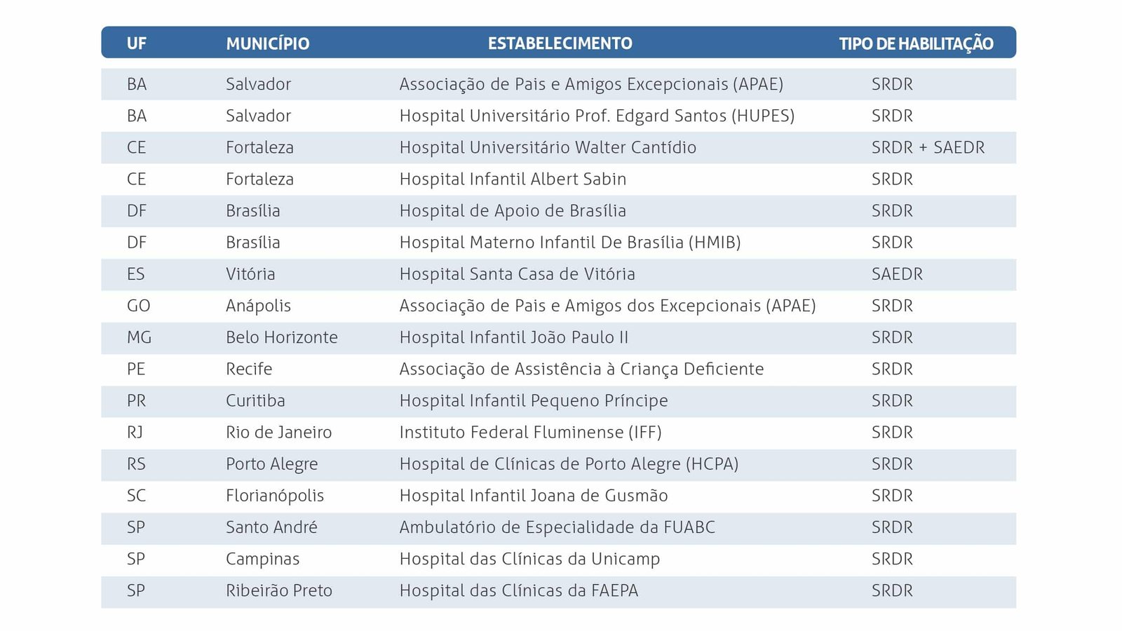 Atualmente, há 17 serviços habilitados, distribuídos em 11 estados e no Distrito Federal. Desses 17, 16 são serviços de referência (SRDR) e 2 são serviços de atenção especializada (SAEDR) – o Hospital Universitário Walter Cantídio, no Ceará, possui uma dupla habilitação. Apenas a região Norte do país não possui nenhum serviço habilitado (Quadro 1).