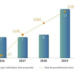 Outra questão relevante quando se fala na estrutura da rede assistencial de cuidado é a produção ambulatorial dos serviços de referência, ou seja, a quantidade de procedimentos realizados no cuidado com pacientes com doenças raras e que são lançados pelos serviços habilitados no Sistema de Informações Ambulatoriais do SUS (SIA-SUS). A discrepância entre o aumento do número de procedimentos realizados vis-à-vis o número de novos serviços habilitados lança luz à questão da falta de informação e de dados reais sobre as doenças raras (Figura 1).