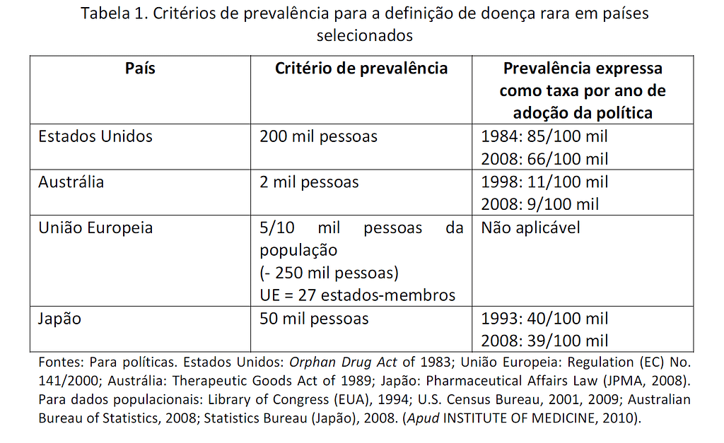 A Tabela 1 revela algumas das definições de doenças raras e seus respectivos países de adoção. No Brasil. até o momento, doenças raras são quaisquer enfermidades que acometem até 65 pessoas a cada 100 mil. Nos EUA seriam aquelas que acometem até 200 mil pessoas; na União Européia, uma pessoa a cada 2 mil. Na Austrália, qualquer doença que afete até 2 mil pessoas e, no Japão, as que atinjam até 50 mil pessoas.