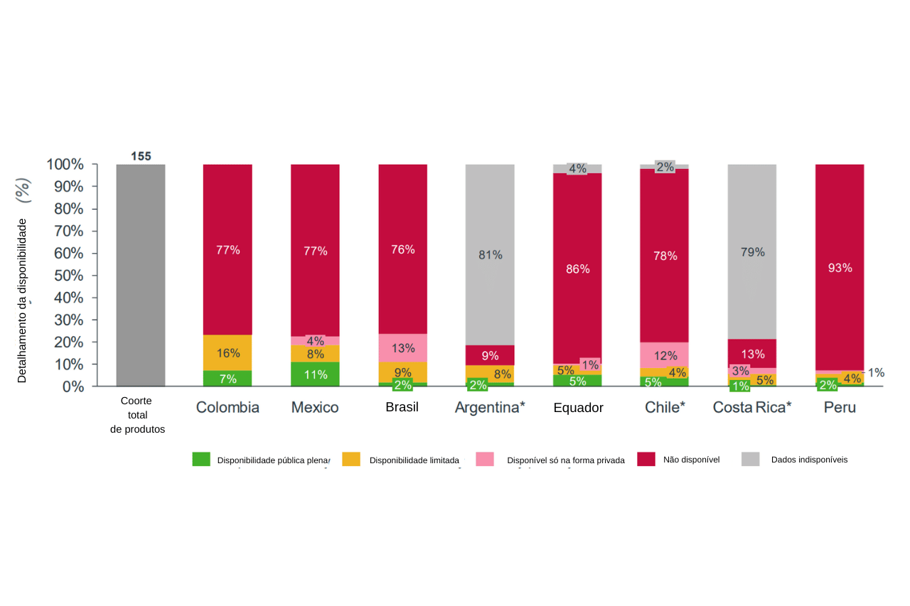 - Dentre os medicamentos inovadores para doenças raras aprovados pela EMA e/ou FDA, apenas 2% estão disponíveis aos brasileiros sem restrições regulatórias no período investigado. O país só perde para a Costa Rica neste quesito. Sexto lugar entre os oito países pesquisados. México lidera o ranking (14%), seguido pela Colômbia (8%).