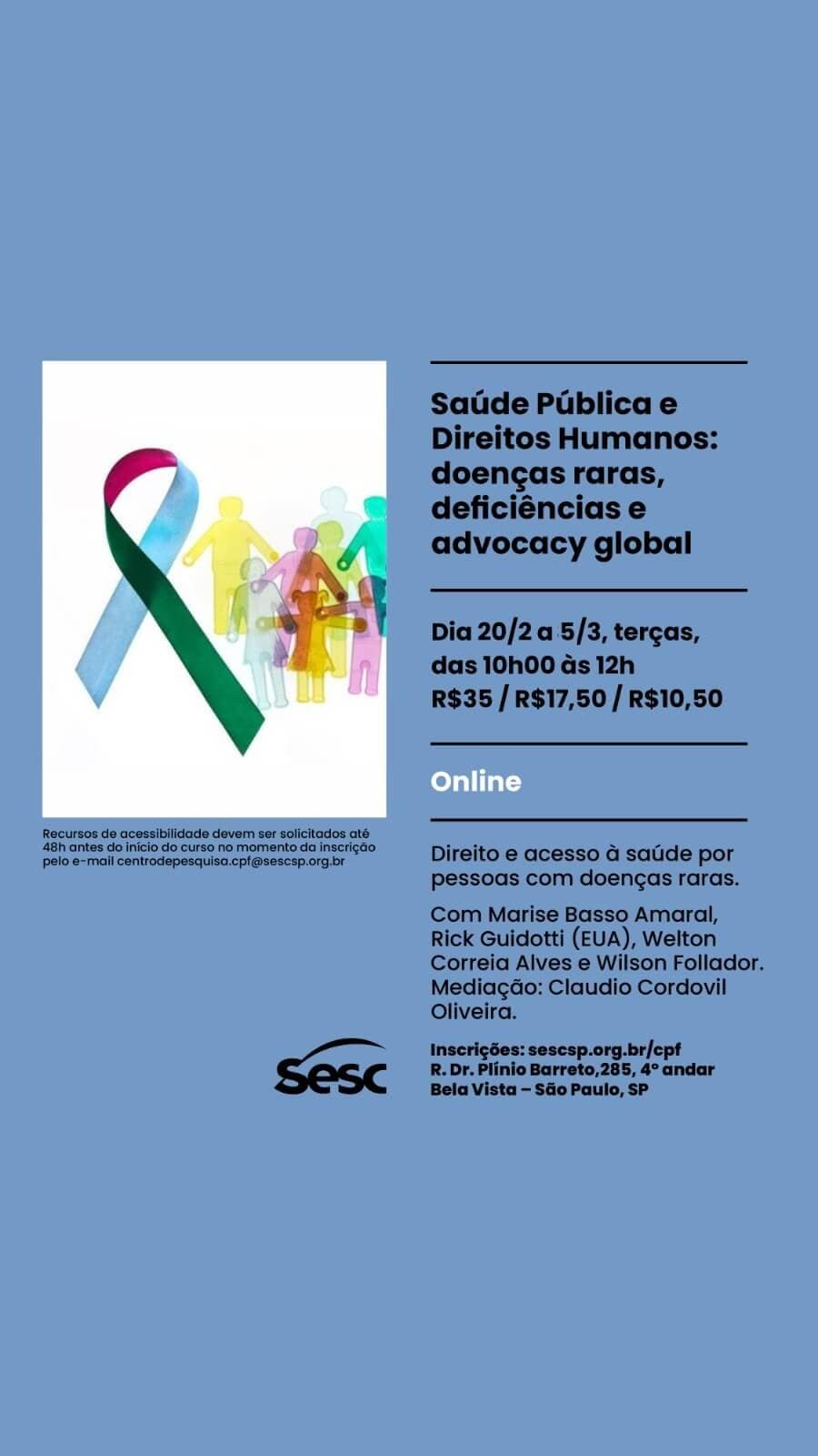 📝 Inscrições: <https://centrodepesquisaeformacao.sescsp.org.br/atividade/saude-publica-e-direitos-humanos-doencas-raras-deficiencias-e-advocacy-global> 🔵